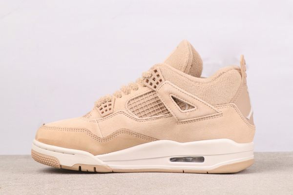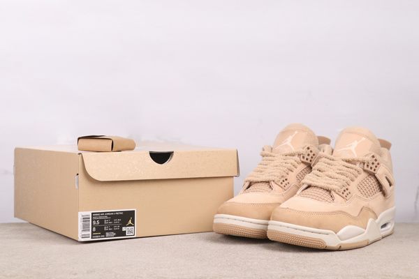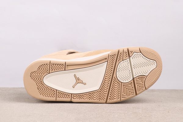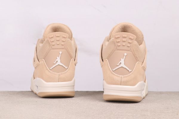 The Air Jordan 4 “Cozy Girl” showcases a soft beige as its principal color. The shoe’s upper is largely composed of this delicate beige, treated with a special suede finish that imparts a fine, velvety texture, reminiscent of being wrapped in a cozy, thin blanket. This color is far from monotonous; it displays a nuanced transition from beige to light camel under varying lighting conditions. This quality not only guarantees a luxurious soft touch but also serves to define functional areas through tonal shifts: the suede at the forefoot is robust and durable, designed for the rigors of daily walking. The mesh on the shoe’s side promotes airflow and breathability. The off-white midsole and outsole act as a visual brightener, establishing a gentle contrast with the beige and apricot tones of the upper, giving the shoe an overall lighter and more open appearance. The laces, made from a matching suede material, integrate flawlessly with the shoe’s design.