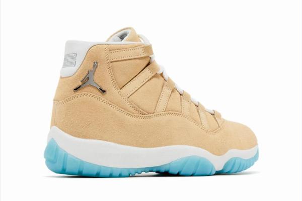 The Air Jordan 11 Wheat White Jade uses a wheat color as its core main color, running through the main area of the shoe body to create a warm and retro atmosphere. The application of suede material adds a delicate texture and layering to the upper, while also considering durability. The midsole is made of pure white rubber material, which forms a sharp contrast with the wheat-colored upper and serves as a visual transition. The most eye-catching feature is the bright emerald green outsole, which has a high color saturation and strong recognizability, becoming the visual focus of the entire pair of shoes.